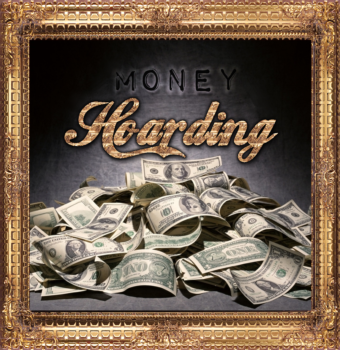 Money Hoarding text in black and gold with gold boarder and a pile of money as a background