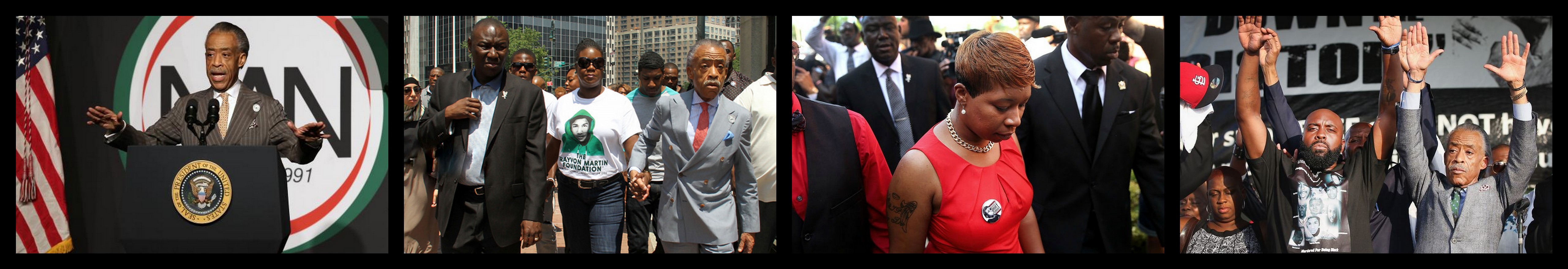 Collage of Al Sharpton with the parents of Mike Brown and Trayvon Martin. (4 pics black background)